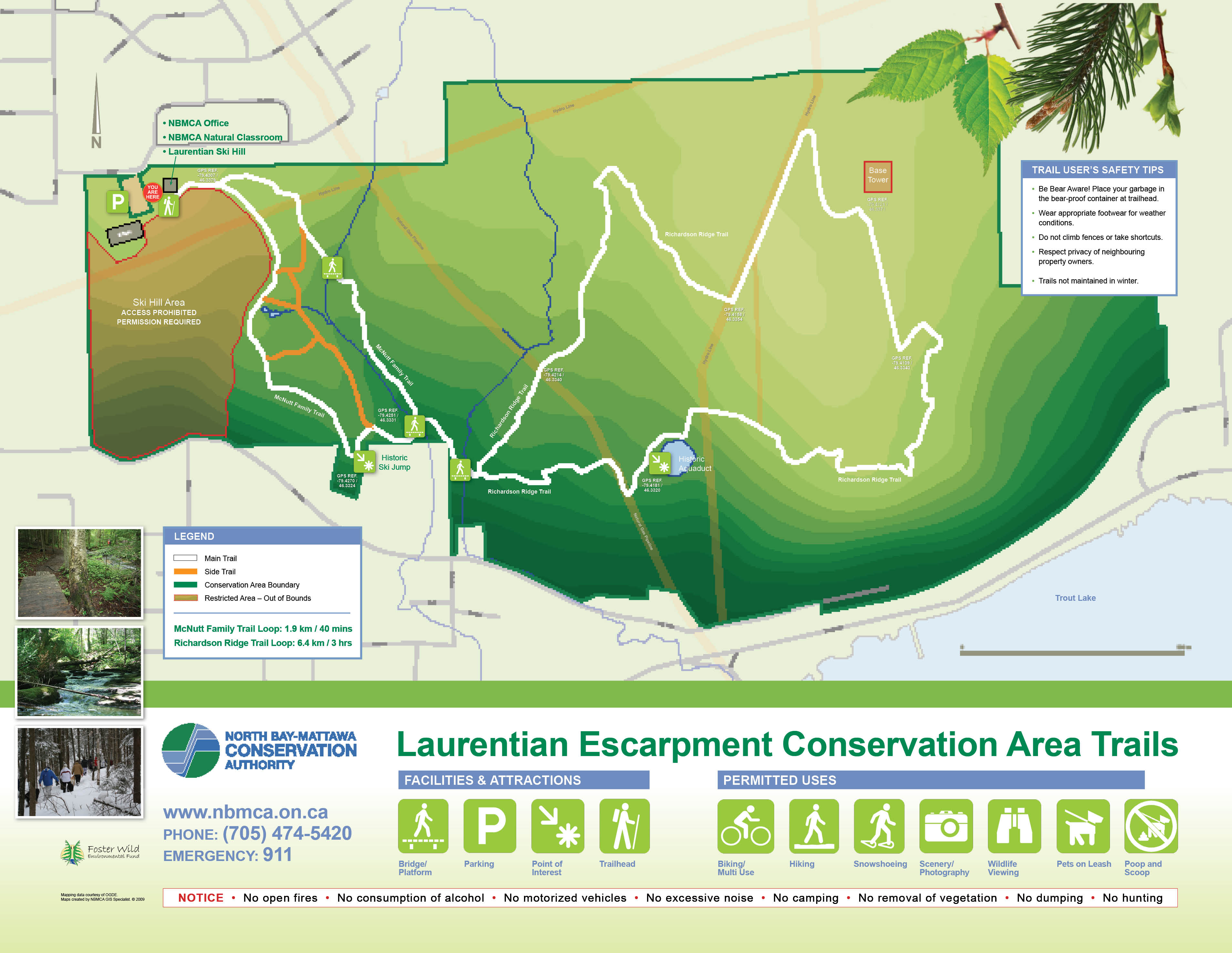 The Laurentian Escarpment Conservation Area boasts a spectacular view of the City of North Bay, Lake Nipissing and the surrounding area. Visitors can hike a number of trails which are maintained throughout the year. The trails offer multi-use experiences including hiking, biking, dog walking, wildlife viewing and snowshoeing. NBMCA has a draft Trails Master Plan for the Laurentian Escarpment that proposes to develop and maintain trails to better accommodate the multi-use nature of the trails and open the door to eco-tourism opportunities, including a pump park. Learn more about the Proposed Master Plan.