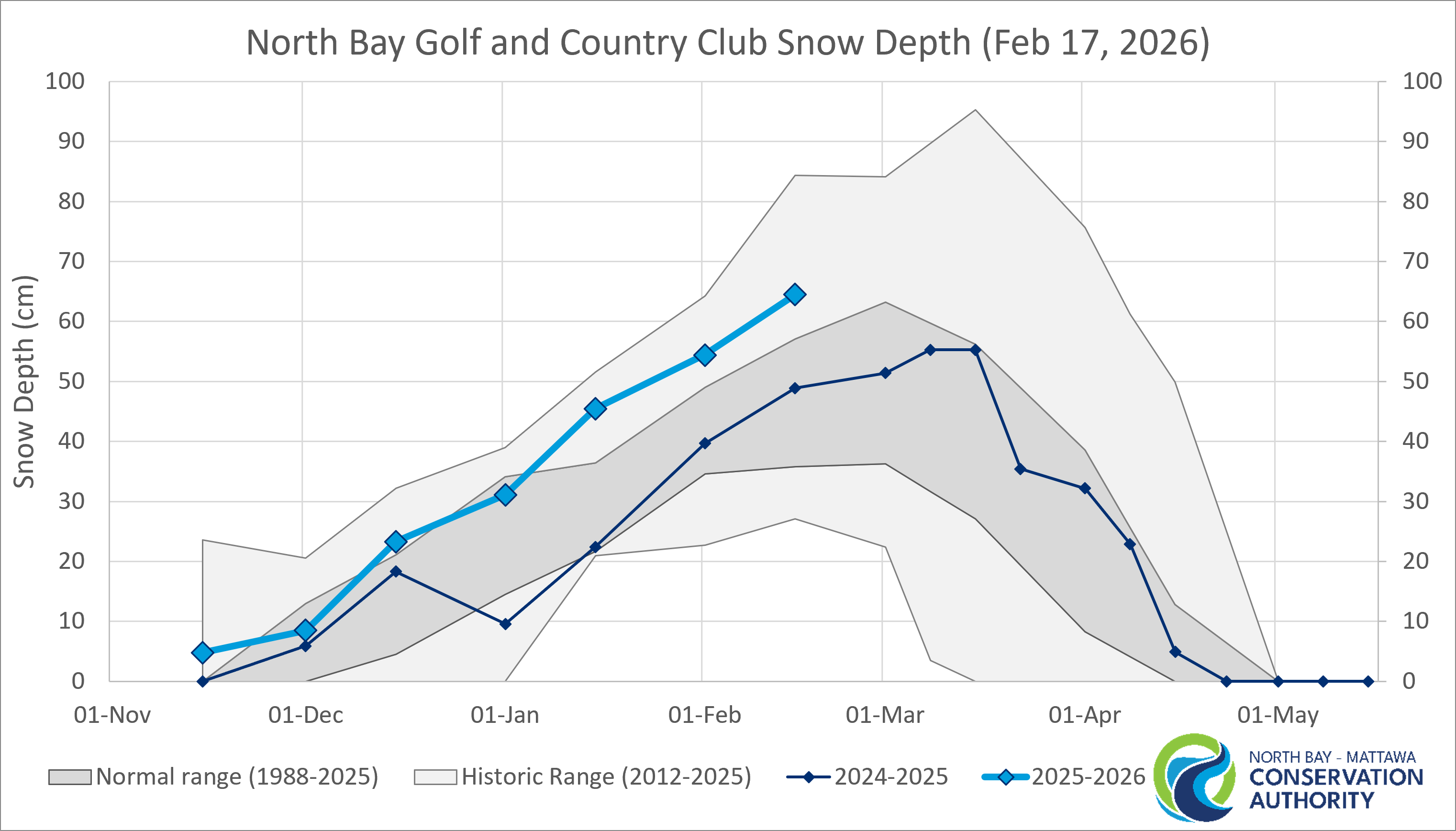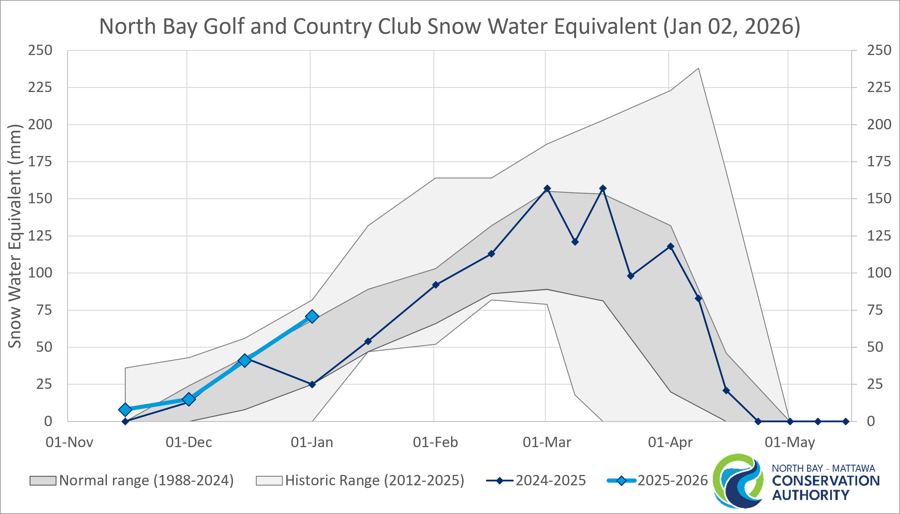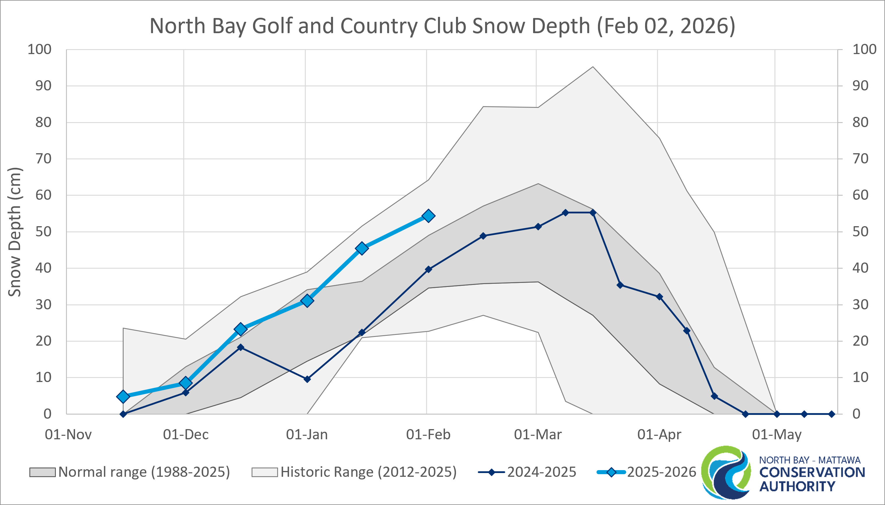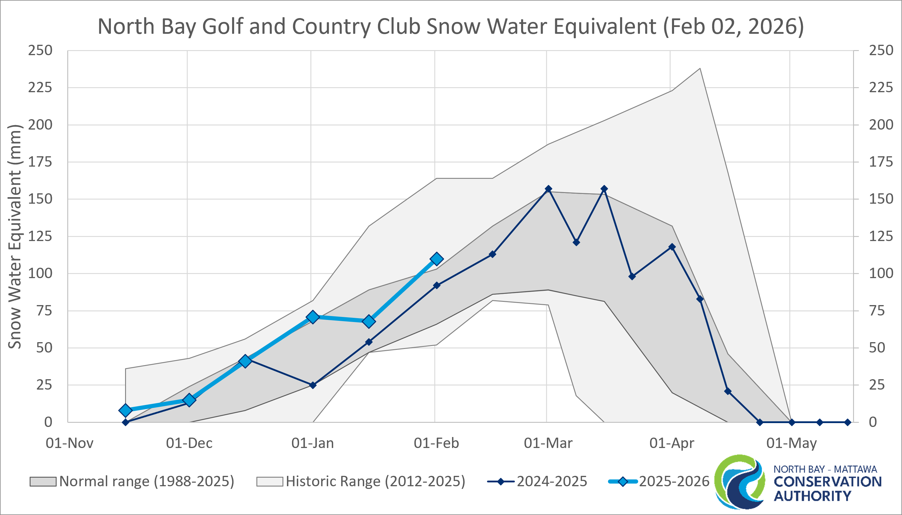 Snow Surveys were conducted at the former Northeast Mental Health Centre between winter 1988-1989 and winter 2011-2012. Snow Surveys have been conducted at the North Bay Golf and Country Club (Chippewa Creek subwatershed) since winter 2012-2013. Reported normal conditions include data from both locations; however maximum and minimum values include only data from the current location.