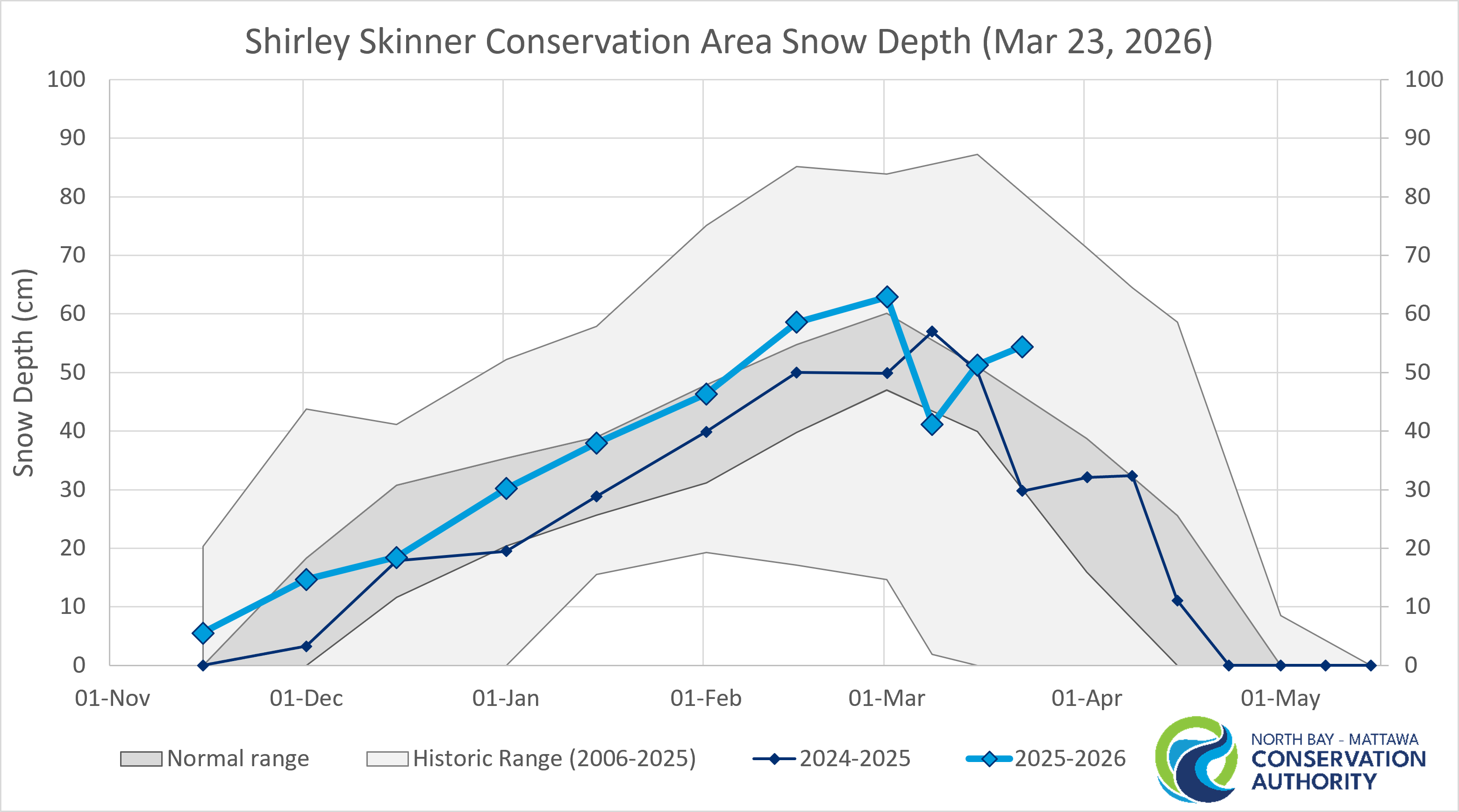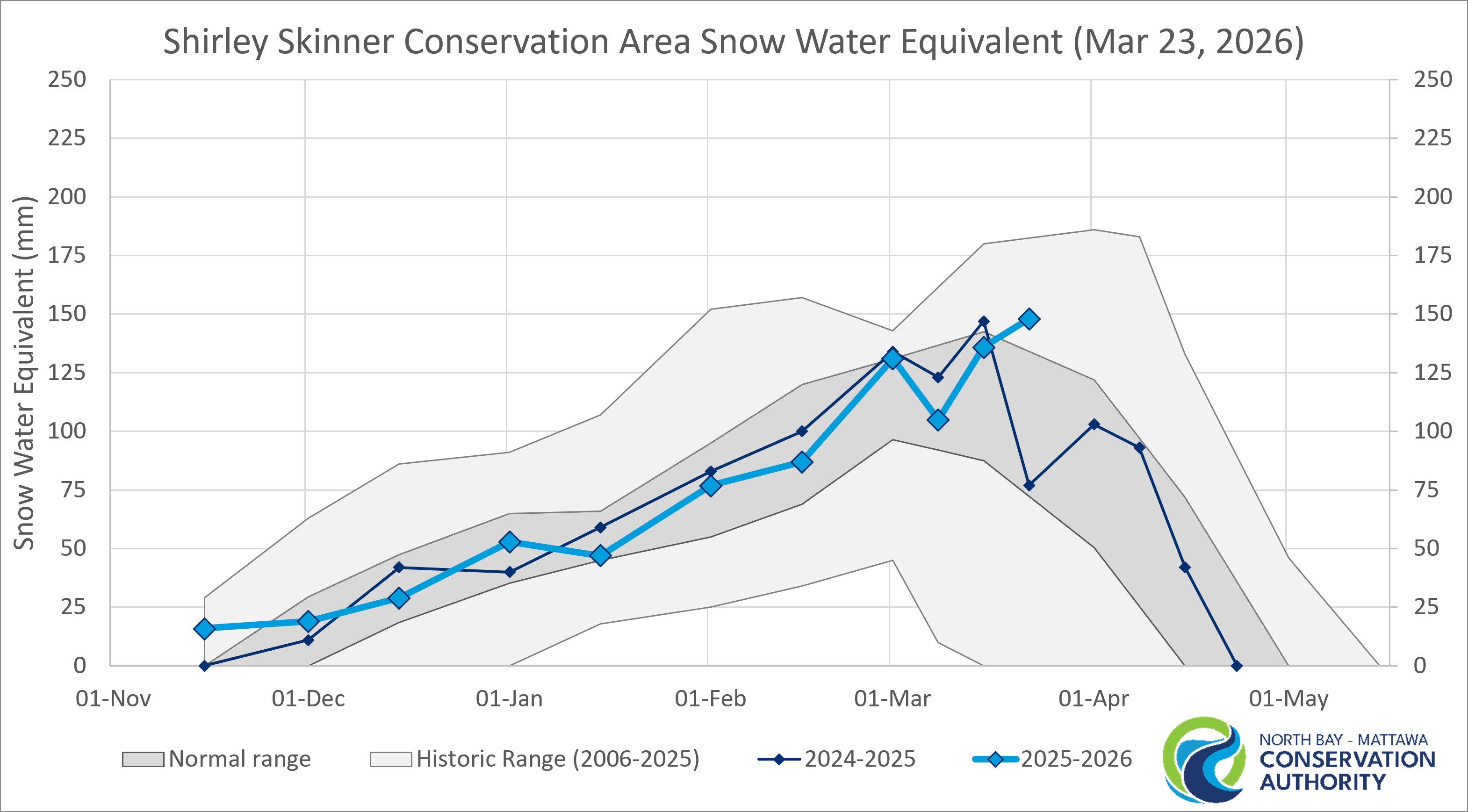 In more recent years, NBMCA has conducted additional surveys around the 8th and 23rd of March and April to prepare for spring freshet. More data is needed to report normal conditions for these supplemental survey dates.