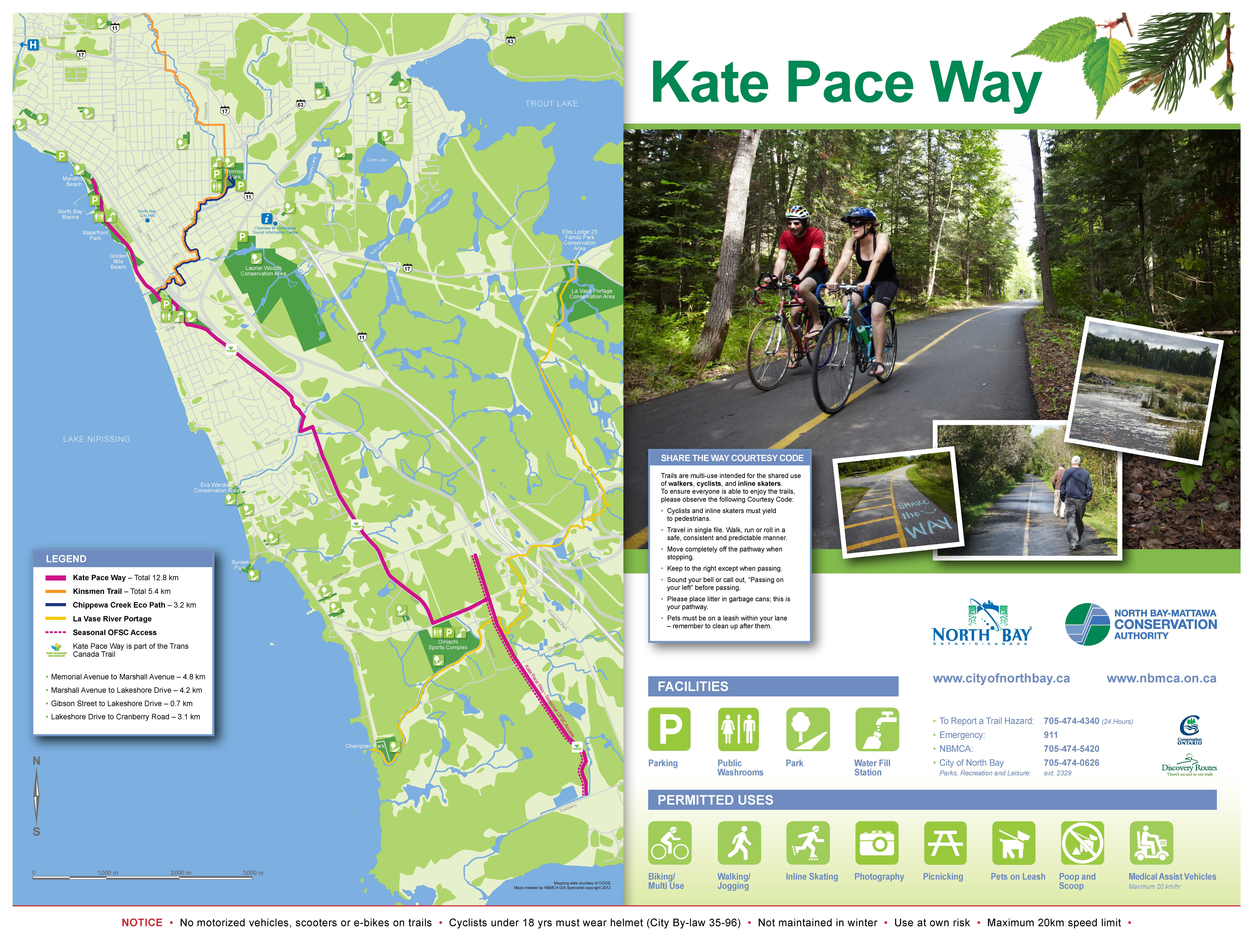 This twelve-kilometre pathway, named in honour of Olympic skier and native daughter Kate Pace, is a multi-use trail for walking, jogging, cycling, and inline skating, and is intended for shared use. The pathway winds through a variety of environments including sections surrounded by trees, streams, and nature, municipal parks, roadways, and residential areas as well as North Bay’s beautiful waterfront. Along the waterfront, walkers may choose to walk along the lock-stone sidewalk which meanders through seasonal gardens managed and maintained by the volunteers of North Bay Heritage Gardeners, and along beautiful Lake Nipissing, while biker and bladers continue along the paved pathway. The pathway runs parallel to Lakeshore Drive.